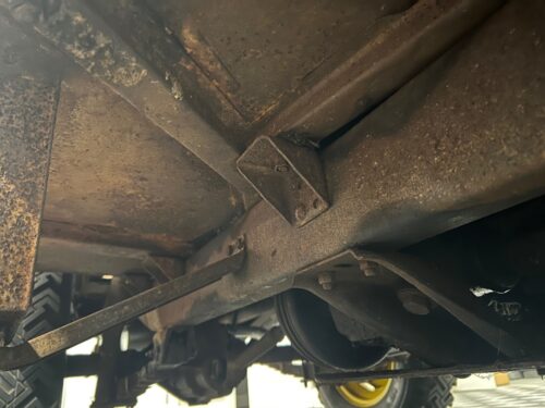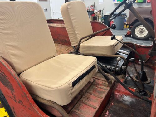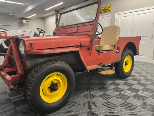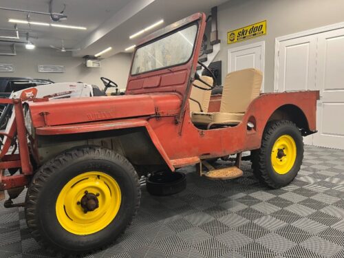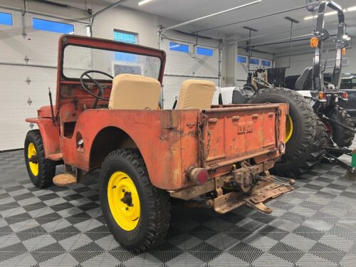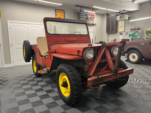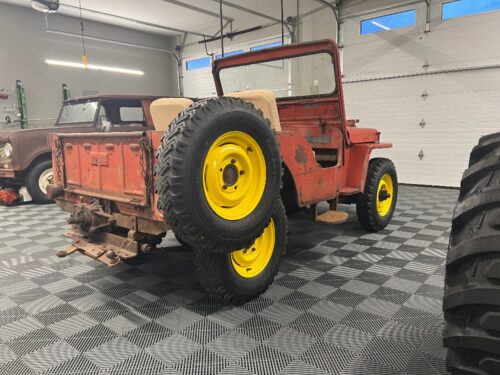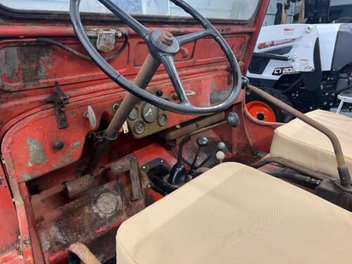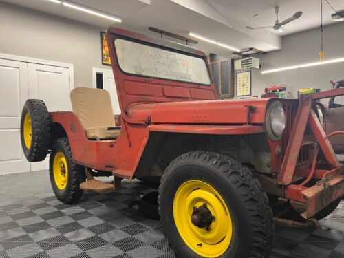 1949 Willys CJ3A. This is an original farm Jeep with working rear PTO and Scheneker Iron Works plow head rig assembly with rare manual hand pump. Has factory foot steps and complete governor PTO handle and linkage.