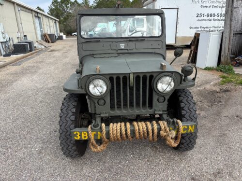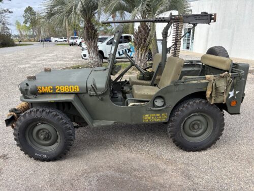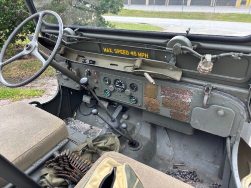 1951 original data plate not a ground up restoration but stone reliable. It was a Marine Corp jeep had undercoating and re-unforced tub corners. I believe this jeep went through a depot and stored. It came out of NC and had no fluids in it anywhere. Stone stock Bubba hadn’t messed with it. I reworked the king pin bearings seals, pitman arm bearing, steering box, new intake, rebuilt carburetor, new fuel lines, new fuel tank, seals in front rear differentials, transmission, new clutch, nos wiring harness, new brakes and lines, gauges, windshield, seat cushions and covers, new tires, M31c gun mount, dummy M2HB and windshield gun mount. I converted to 12v but the 24v regulator is in the jeep and I have the 24v generator and distributor. No scammers tolerated will not ship but will assist to load. No trades. $16,500. SOLD