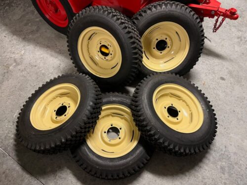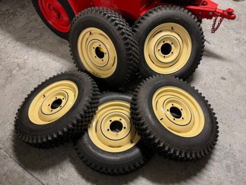 Matching set of five original, restored stock CJ2A wheels and Firestone tires. 6.00 x 16”.